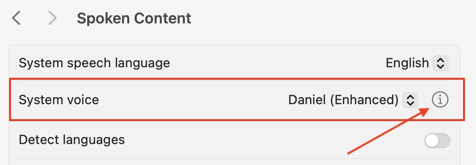 The selected voice can be controlled from the Spoken Content Settings. Click the ℹ︎ symbol to show the full voice settings