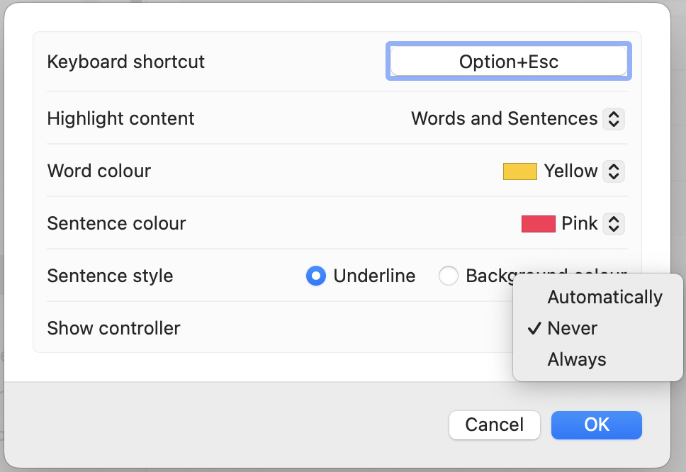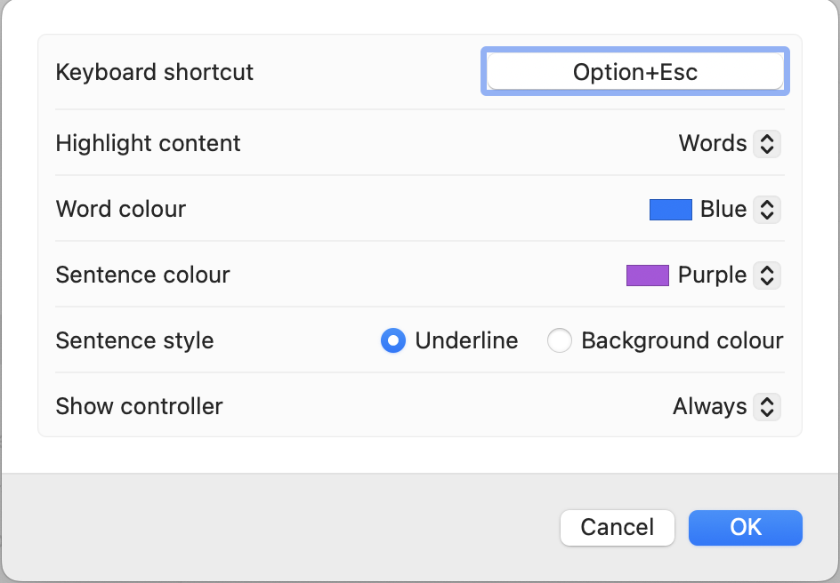 When text content is being spoken, there are a range of options for highlighting the colours of the word, sentence and also underline highlight the sentence.