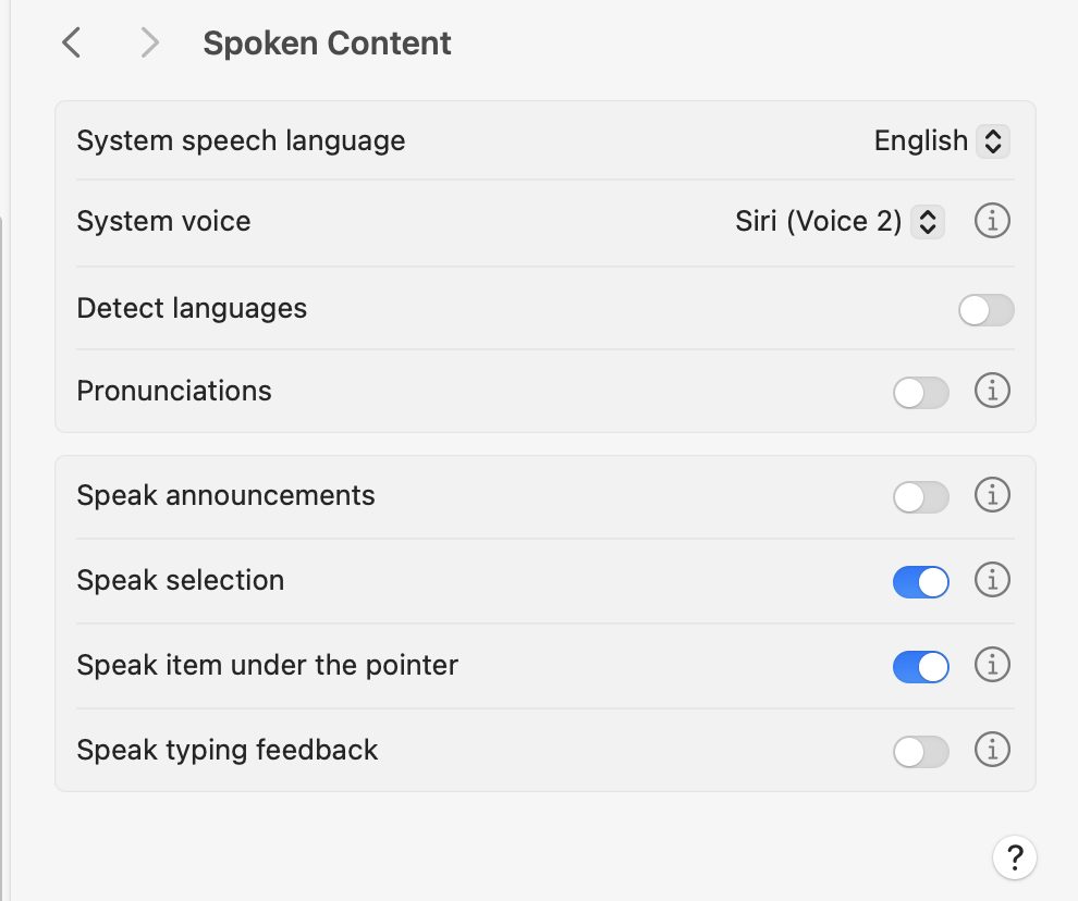 Read Apple Help Page for Spoken Content Settings on your Mac