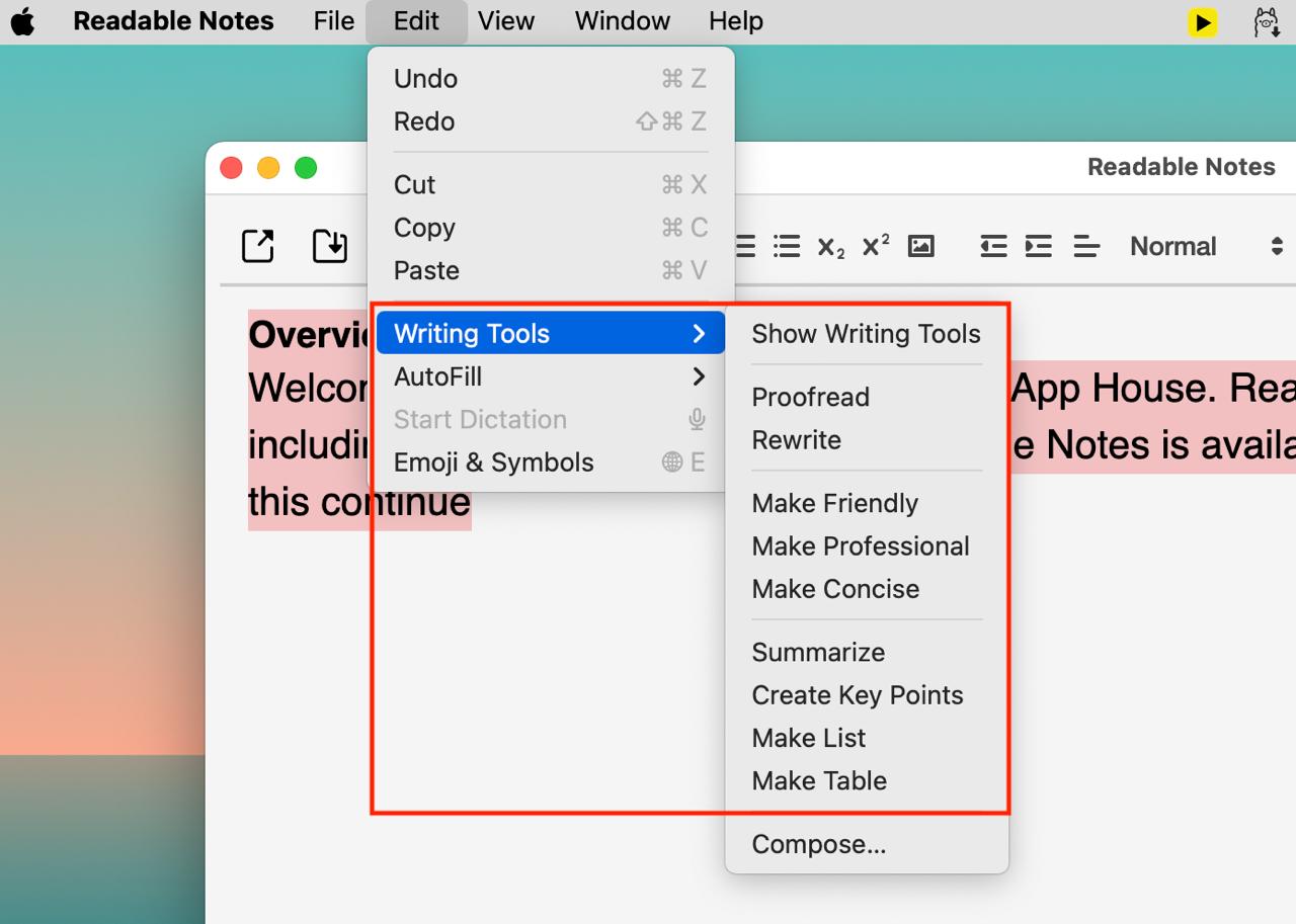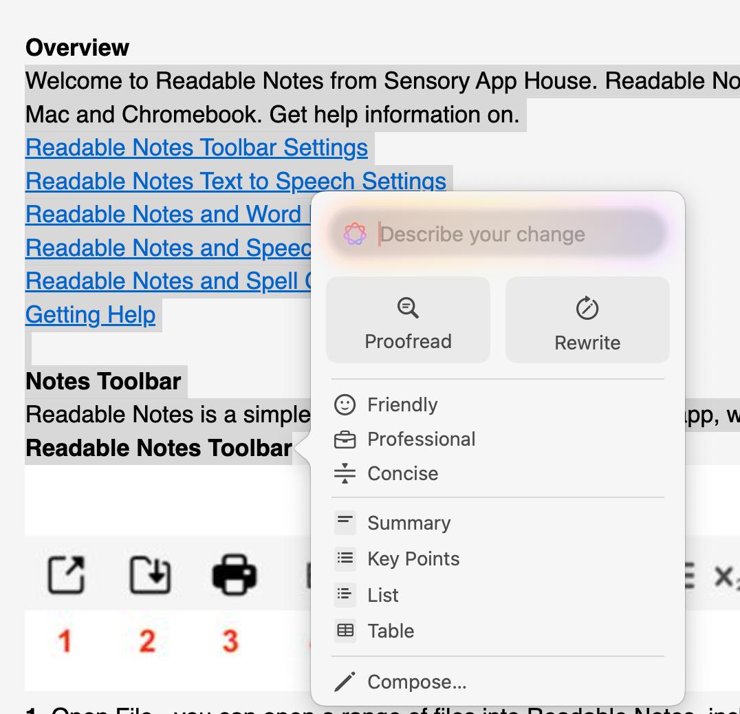Readable Notes for Mac fully integrates and supports with the excellent Apple Writing Tools, allowing for offline proofreading, summarisation and key point generation. See below.
