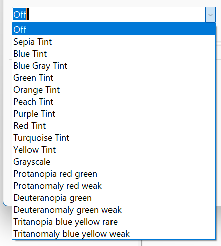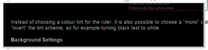 Select Ruler Tint button and then experiment and choose a colour tint for the ruler window if required. Each time you close Sensory Ruler (by clicking the x button in top right) it will remember your last settings. Instead of choosing a colour from the palette, you could select one of the preset colour schemes. The preset colour schemes, are below, and include colour adjustment schemes for various colour vision deficiency situations.