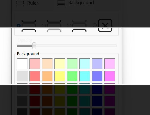 The tint level of the area above and below the ruler can be set independently of the ruler tint. You can tint above the ruler, below the ruler, or above and below the ruler together. You can also choose the colour tint and the "opacity" of the background.